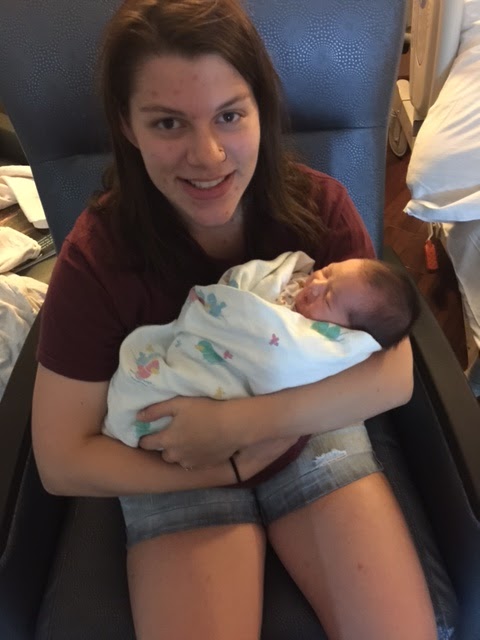 Not long after, she started rooting on her own and breastfed like a professional. The rest is a blur. Time kind of doesn't pass or passes too quickly. I was encouraged to keep track of her feeding and pooping and wets. Every 2-3 hours she should be eating. Five to ten minutes on each breast. Burp in between. Order food before the cafeteria closes. Announce to everyone the news. And answer when they respond back. Answer nurse pain scale questions and have blood pressure and temperature constantly taken. That was our job. Mila ended up staying in our room the entire time; we never sent her to the nursery. She never really wore us out. She was so peaceful. Our guests on the other hand… they at least wore ME out! The very first visitor, at probably 10:00am, was no one other than Pastor Sharon. Our other visitors the first day were: Lily and Veronica (who got to see Mila have her first bath); Mom, Luke and Granddad; Maecy; Mitzy and Chloe; and Lalo. The next day our visitors were: Dad; Stacia and the girls; Veronica again; Lily again; and the Cubbages (who helped us pack up and leave). Because the Gutierrez family and Cameron were in Florida on a family vacation, we only got to FaceTime with them during the hospital stay.